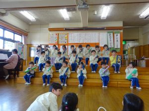 以上児の各学年がステージ上で合奏をしました。