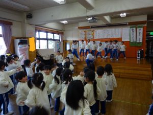 “エビカニクス”の曲に合わせて以上児の全学年で身体を動かしたり、楽しい時間を過ごしました。