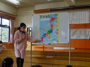 朝のお集りでは、宮崎県がどこにあるのか、どのくらい離れているのかを子ども達と確認しました。