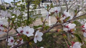 ひまわりホールと未満児園舎の園庭に、桜が咲いています。
