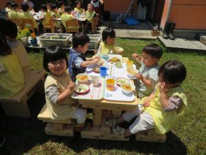 今後、他のクラスのお友達も園庭での給食やおやつを楽しみましょうね😉