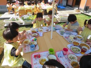 昨日は、たんぽぽ組さんが園庭での給食を楽しみました😆