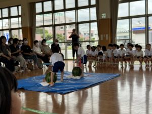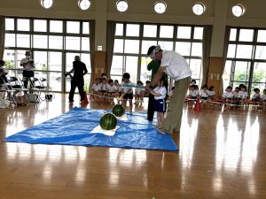 今日は、ひまわりホールで以上児のすいかわり会を行いました。