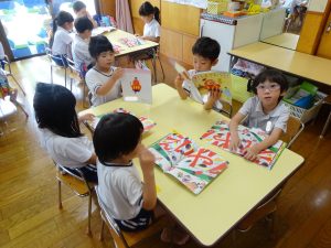 2024.08.20 日々の様子 8月20日(火)🌞 今日は、ひまわり組さんのお友達が絵本の読み合わせをしました🔖 園では、毎月年齢に合った絵本を持ち帰ります。 ひらがなが読めるお友達もいますので、指で追いながら真剣に読んでいます👍 絵本には、脳の発達や想像力・感性が育ったり、語彙が増えたりなど子どもにとって良いことが沢山です✨ 1日1冊、寝る前に絵本の読み聞かせをしてあげると良いですね😊