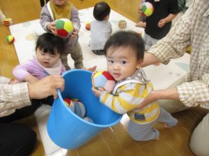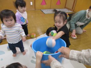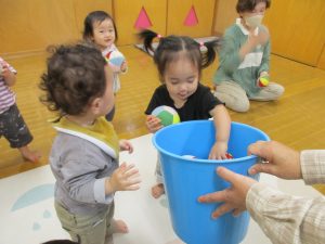 つぼみ組さんのお友達もお兄さん、お姉さんに負けじと楽しそうに玉入れをしていました。
