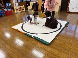夕方の自由遊びの時には、今月行われるすもう大会に向けて練習をしました。