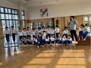 2025.02.04 日々の様子 2月4日(火)☁️❄️ 今日は、以上児のお友達がHACを行いました。 ひまわり組さんは、HACの先生と集合写真を撮りました📸 みんな良い笑顔でした😀 来月のHACが最後となります。ひまわり組さんは、これから「最後の〇〇」が増えていきますね…🥲 その頃つぼみ組さんは、昨日に引き続きホールで遊びました。 ボールを転がして追いかけたり、ジャンプをして身体を動かしました😁 つぼみ組さんのお友達もHACをしているみたいですね😉