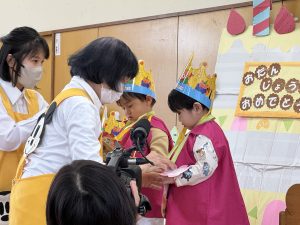 2025.02.18 日々の様子 2月のお誕生会🎂 今日は2月生まれのお友達のお誕生会を行いました🎉 未満児5名、以上児8名のお友達を皆でお祝いしました。 インタビューやキャンドルサービス、各クラスからの歌のプレゼントなど、盛り沢山の会となりました😀 園長先生から色紙とペンダントもいただきました✨ また、以上児はお家の方にもご参加いただき、お祝いのメッセージを直接お子様にお伝えしていただきました。 寒波で寒い中ご参加いただき、ありがとうございました。 お誕生児の皆さん、お誕生日おめでとうございます❗🎊