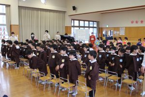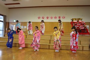 ひな祭りの由来やひな人形の紹介、各クラスの制作の紹介、歌の発表を行いました。
