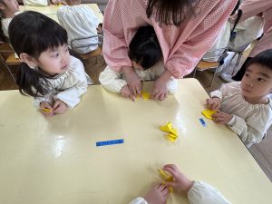 手先を器用に使い、折り紙を上手に折って、制作帳に貼る準備中です🎶