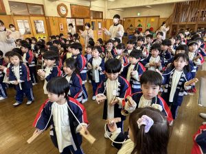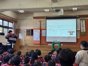 今年度初めてなので、幼年消防クラブの内容や法被に書かれている「防火・火の用心」の意味を学びました。