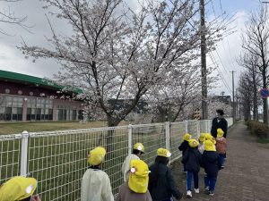 ひまわりホールの桜を見ながら畑まで歩きます。