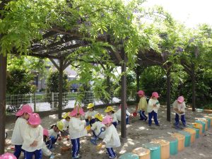 暖かくなり、園庭の藤棚の藤が満開になりました👐