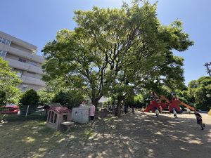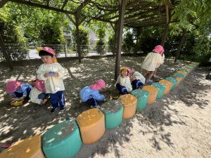 園庭の大きな木や藤が生長し、良い感じに日影ができています。