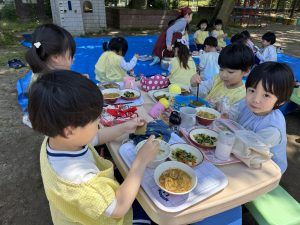 お昼は、ゆり組さんのお友達が園庭で給食をいただきました。