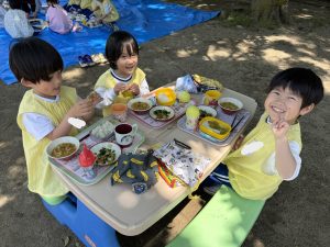 ゆり組さんになってから初めてのお外での給食を笑顔で楽しみました😀