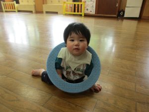 つぼみ組のお友達は、以上児のお友達がウキウキツアーに出かけている時に、ホールで遊びました。