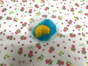 カルピス味のゼリーの上に青色のゼリー、みかんがのっていました🍊