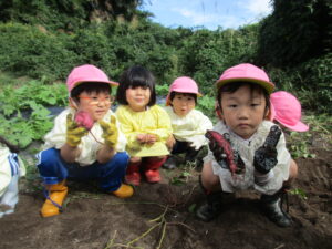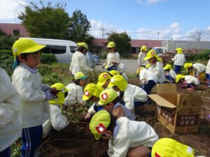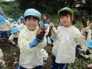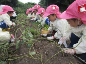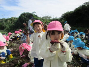 2025.10.09 日々の様子 10月9日(木)🍠 今日は、いもほり会を行いました🍠 天候にも恵まれ、さつまいも掘りができました。 今年は、例年より少し小ぶりのさつまいもが多く、見つけるのも一苦労でした。 根気よく掘り、紫色が見えると、「あった❗」と嬉しそうな表情の子ども達でした😄 例年よりも数は少ないですが、沢山のさつまいもを収穫することができました。 収穫したさつまいもは、給食や焼き芋会でいただきましょうね😙 長靴や軍手のご用意もありがとうございました❗