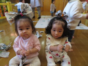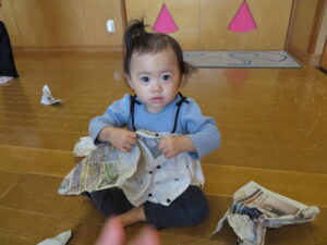 2025.10.23 日々の様子 10月23日(木)🌞 今日は気持ちの良い秋晴れでしたね。 以上児のお友達は水泳指導でした。 バス出発前に園庭で遊んだりと元気いっぱいの子ども達でした😙 つぼみ組のお友達は、新聞紙遊びをしました。 丸めたり、ちぎったりして、指先を使って遊びました。 また、くしゃくしゃにした時の音も楽しみました👂 新聞紙のリボンも付けて、よりかわいく変身しました🎀 様々な遊びを通して、五感を養ったり、子ども達の興味を引き出していこうと思います🤗