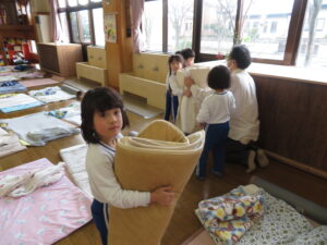 午睡のためのお布団敷きは、ひまわり組さんの担当でしたが、3学期からゆり組さんの担当になりました。