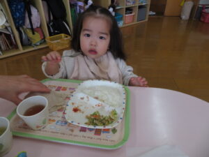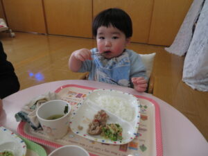 つぼみ組のお友達は、スプーンで食べるのが上手になってきました。