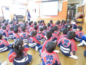 今日は、今年度最後の幼年消防クラブ・交通安全教室・カルタ会を行いました。