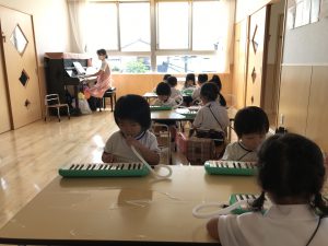4月に初めてメロディオンを触った年少もも組さんも段々と上手になってきました。