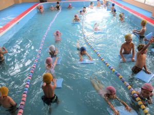 広い温水プールで、外部のプールの先生に泳ぎ方を指導してもらいました。