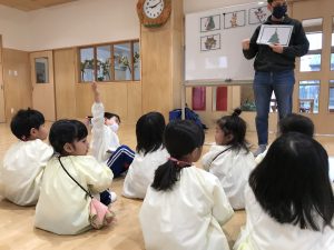 2021.12.15 お知らせ, 日々の様子 ABC(英語教室) 今日は、ABC(英語教室)がありました! 今日はクリスマスについての英語を教えてもらっていました🎄 ”Santa(サンタ)”、”雪だるま(Snowman)”などと、言っていました。