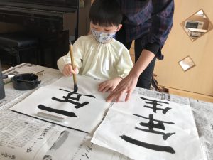 2022.01.11 お知らせ, 日々の様子 書初め! 今日は、もも組さん、すずらん組さん、ちゅうりっぷ組さんが 書初めをしました。 今年1年、元気に楽しく過ごせるように願いを込めて書きました。 もも組さん「たこ」 すずらん組さん「とら」 ちゅうりっぷ組さん「一年生」 と書きました。 ご自宅に持ち帰る予定ですので、楽しみにお待ち下さい。