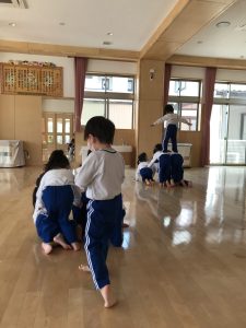 2022.04.21 お知らせ, 日々の様子 ファイト!組体操! 運動会に向けて、組体操をしています。 もも組さん、初めての組体操にむけてやる気いっぱいです。 ちゅうりっぷ組さんは、複数人で行う難しい組体操にも挑戦しています。 なかなかバランスとるのが難しく、頑張っています!