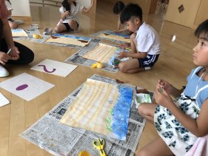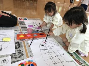 今日は、ホールや絵本コーナーを使ってお絵描きをしていました。