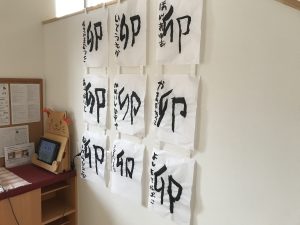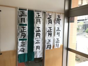玄関には、ちゅうりっぷ組、すずらん組さんの書初めが掲示されています。