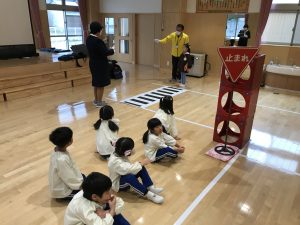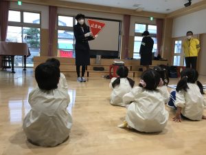 2023.01.23 お知らせ, 日々の様子 年長交通安全教室 今日は、東区役所の総務課 安心安全担当の方がいらして、 「年長児 交通安全教室」が行われました。 年長 ちゅうりっぷ組のお友達が真剣に話を聞いていました。 4月からは、小学校1年生なので、道路を歩く練習をしていました。