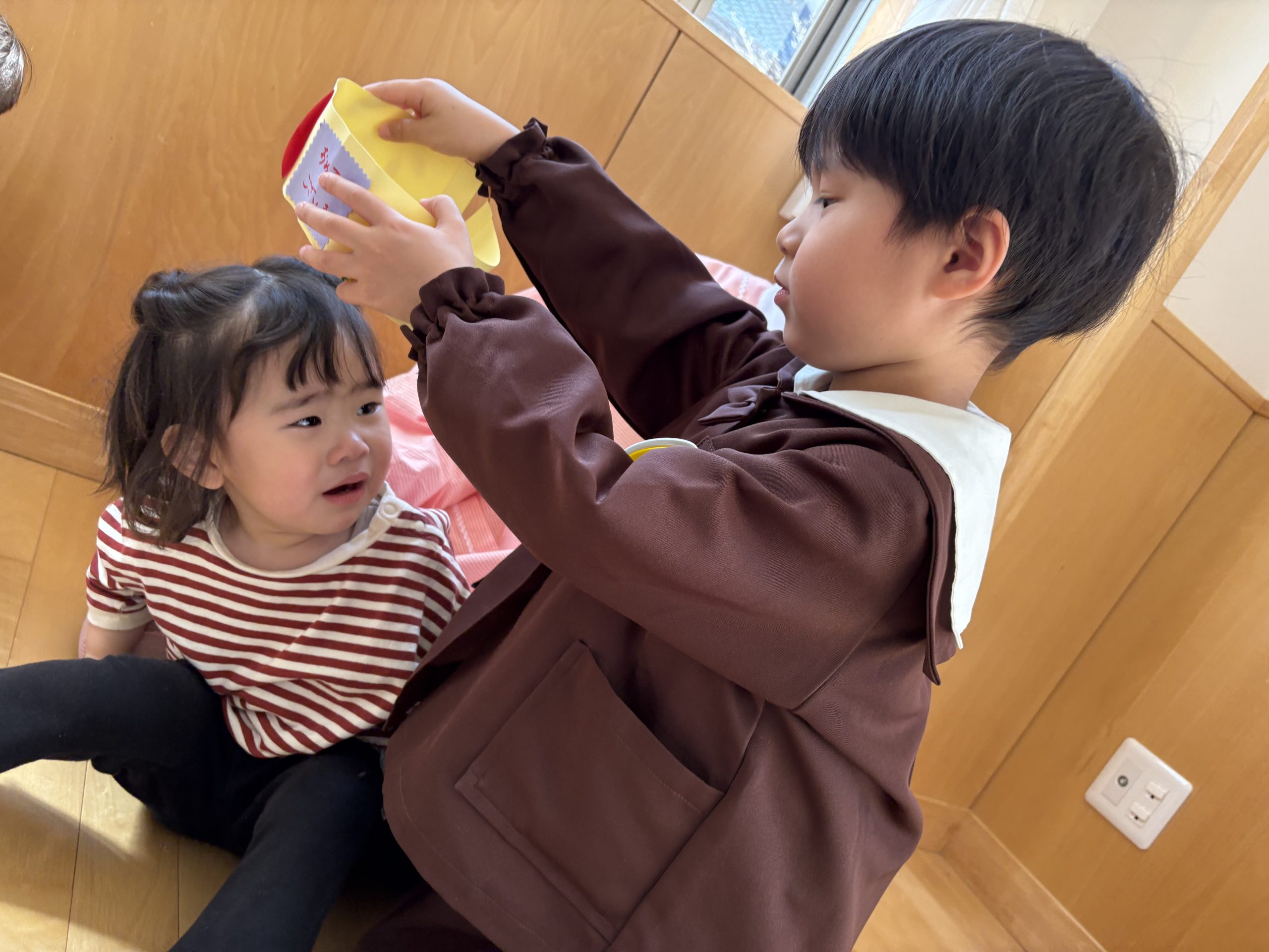 新入園児のお友達は、まだ涙が見られる時もあります。(大好きなお家の方と初めて長時間離れ離れになって過ごしているのですから、当然です)