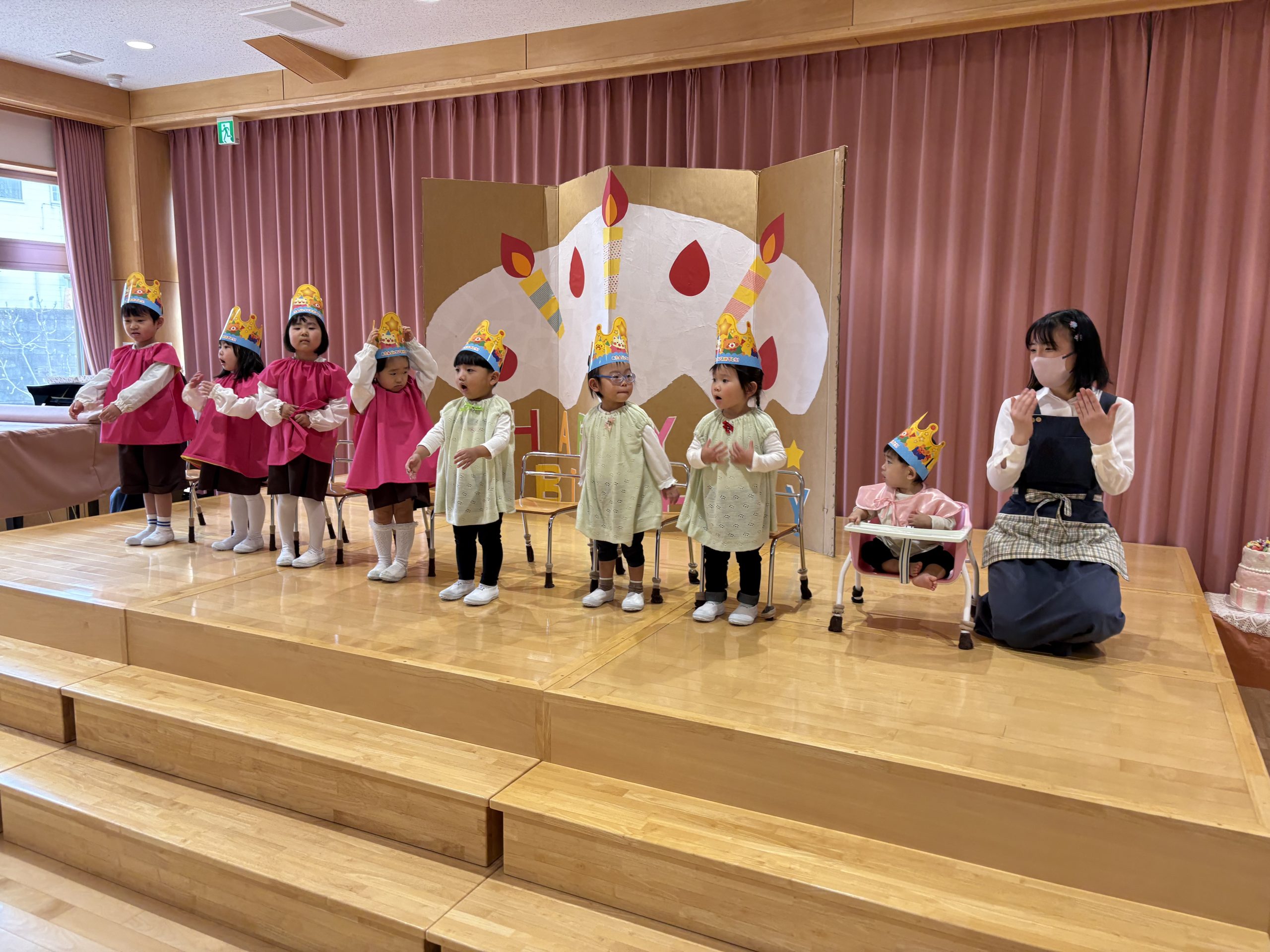 当園では、毎月、年少・年中・年長の保護者の方をお招きして、お誕生会を行っています。