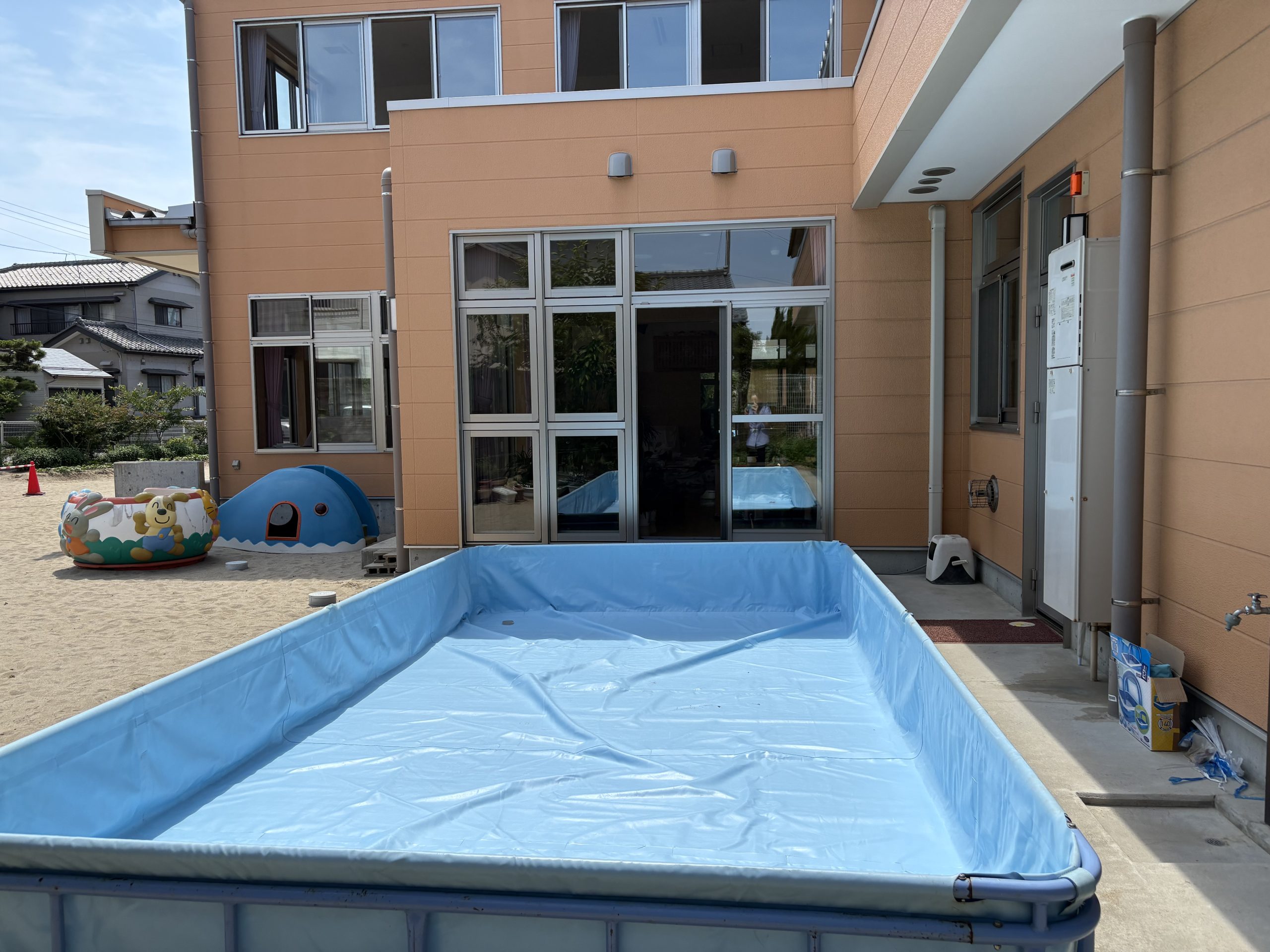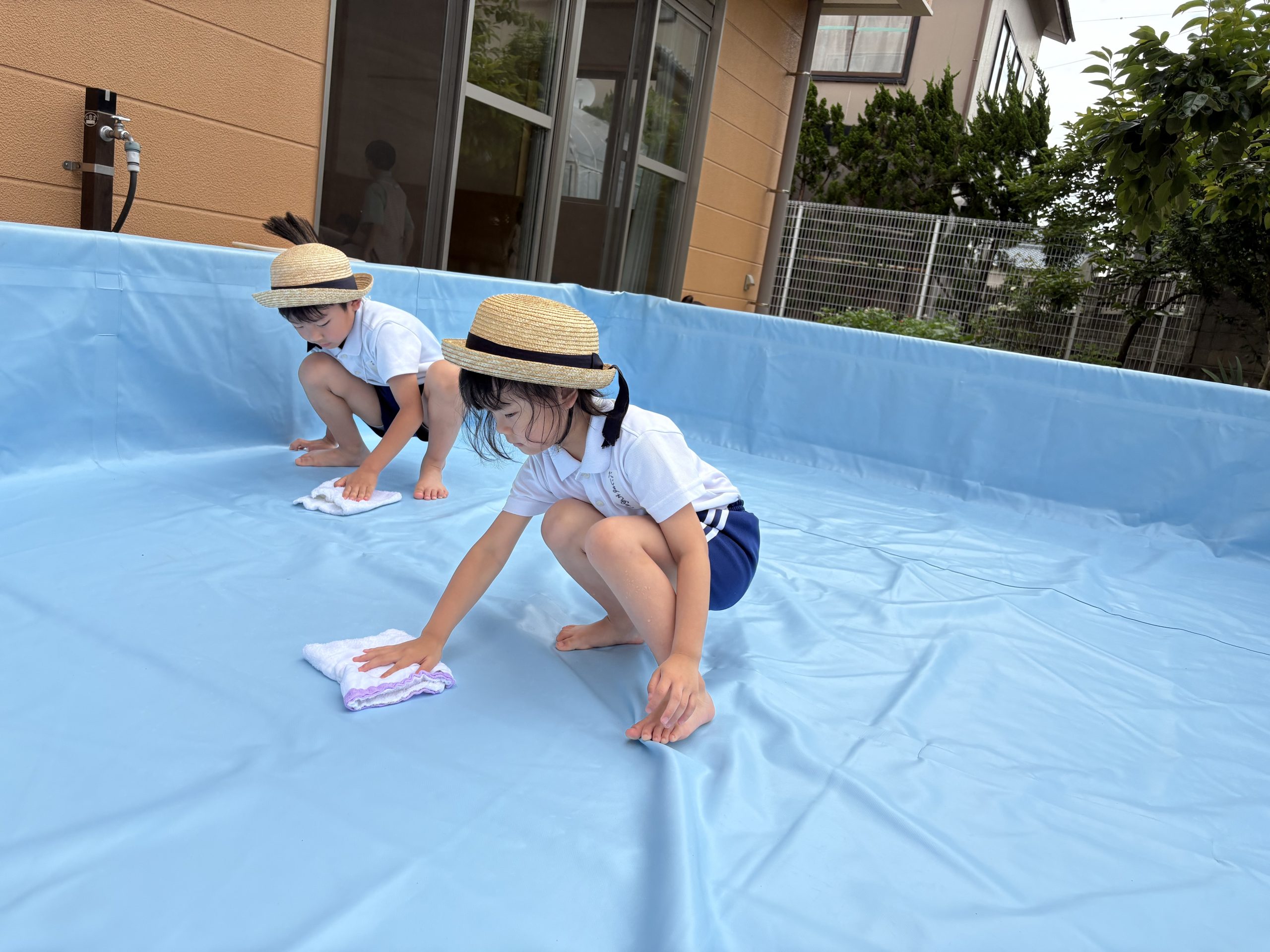 プールはもちろん職員の手でせっせと組み立てのですが、最後の仕上げの掃除は、5歳児 ちゅうりっぷ組さんに協力してもらって一緒に行いました。