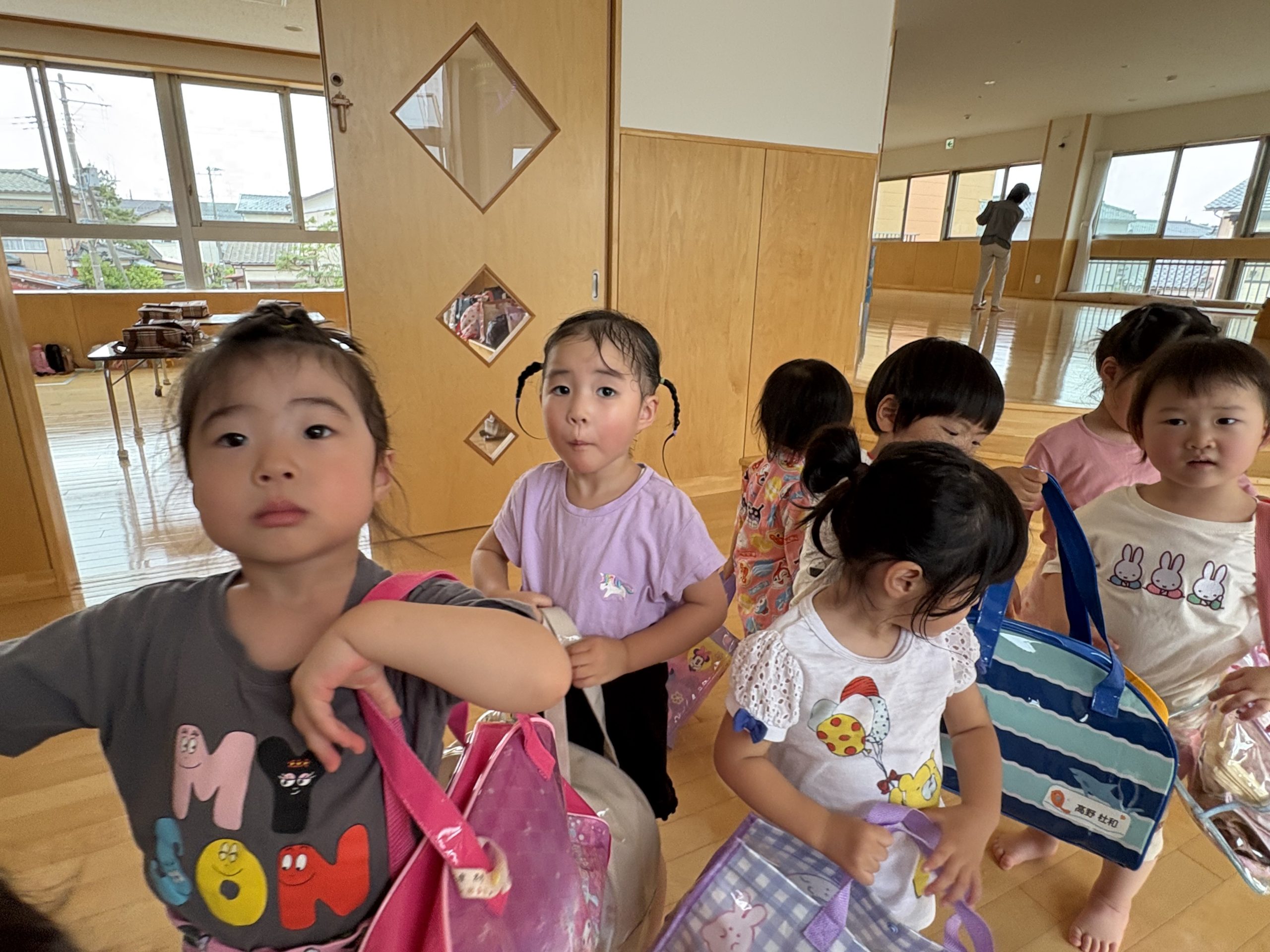2歳児 つくし組のお友達もお気に入りのプールバックを嬉しそうに持って、水遊びを楽しんでいます。