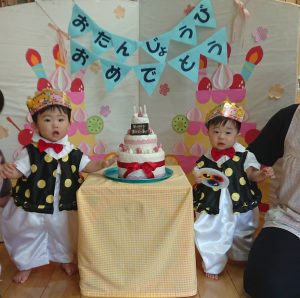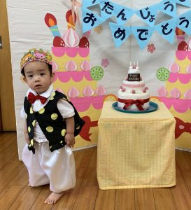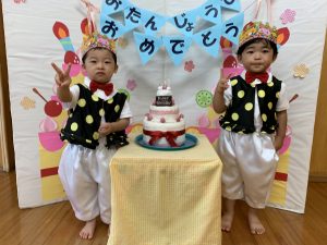 2021.08.27 日々の様子 お誕生日おめでとうございます! 今日は8月生まれさんのお誕生会でした。 かわいい衣装を着て王子様に変身です。 今月は偶然、全員が男の子でした。 ピアノに合わせてハッピーバースデーの歌を歌ってもらって、みんなでお祝いしました。 2歳児さんは3歳の3を指で上手に作り、 「3歳!!」 と上手にインタビューに答えていました。 お誕生日おめでとうございます!