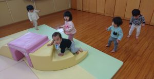 0歳児さんはホールでかけっこしたり、ソフト遊具の上をのぼったり、くぐったりと