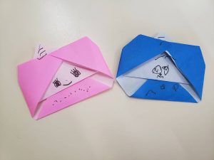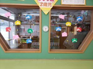 2歳児さんが折り紙で折った鬼です。お部屋に飾りました。