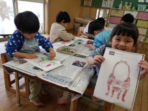 今日は節分です。一昨日、持ち帰りました鬼のお面、新聞紙で作ったボールを豆にみたてて、