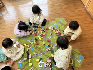 1歳児さんは電車のおもちゃを連結させて線路に走らせて遊んでいました。