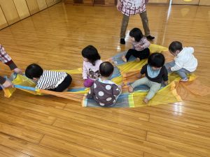 0歳児さん:手作りパラバルーンで遊びました。