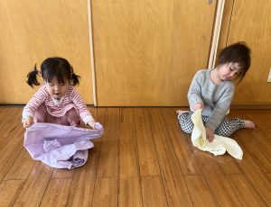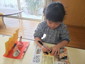 2歳児ばなな組さんはひな人形の制作の続きをしました。