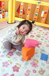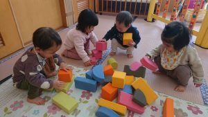 お友だちと一緒に様々な形の積み木を選んで重ねていました。