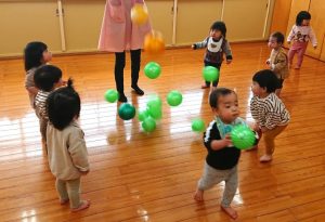 ボールで遊んでいる様子です。 段々と腕の力がついてきて、「えいっ」と上手に力強くボールを