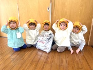 くまさんの防災頭巾をかぶる子どもたちがかわいいので、