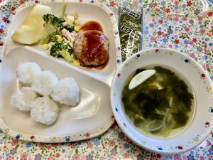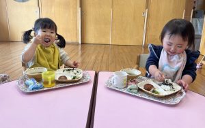 1歳児いちご組さんも「ハンバーグ!やったー!」